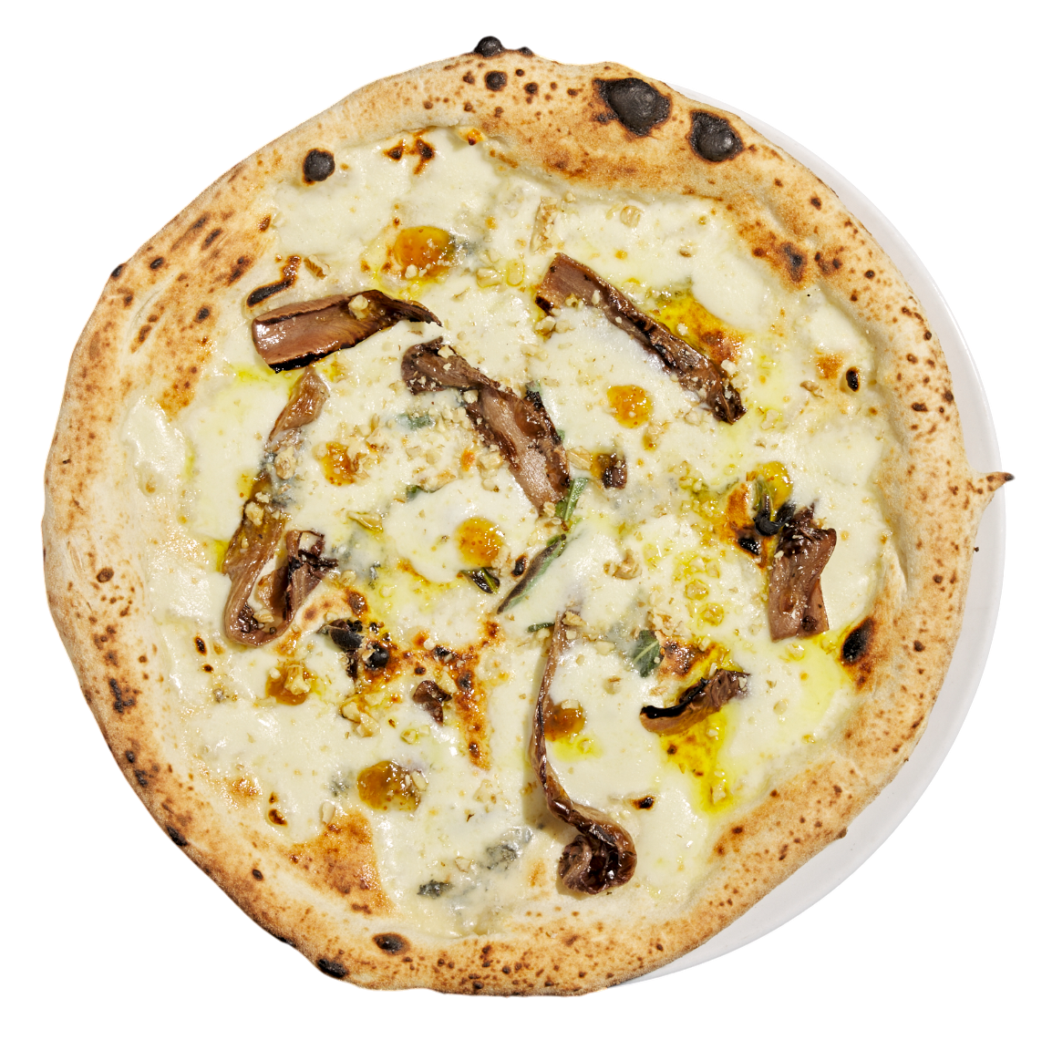 Fior di Latte -mozzarellaa, valkosipulia, valkosipuliöljyä, kuivattua chiliä, Pecorino- ja Gran Biraghi -juustoa, lehtipersiljaa