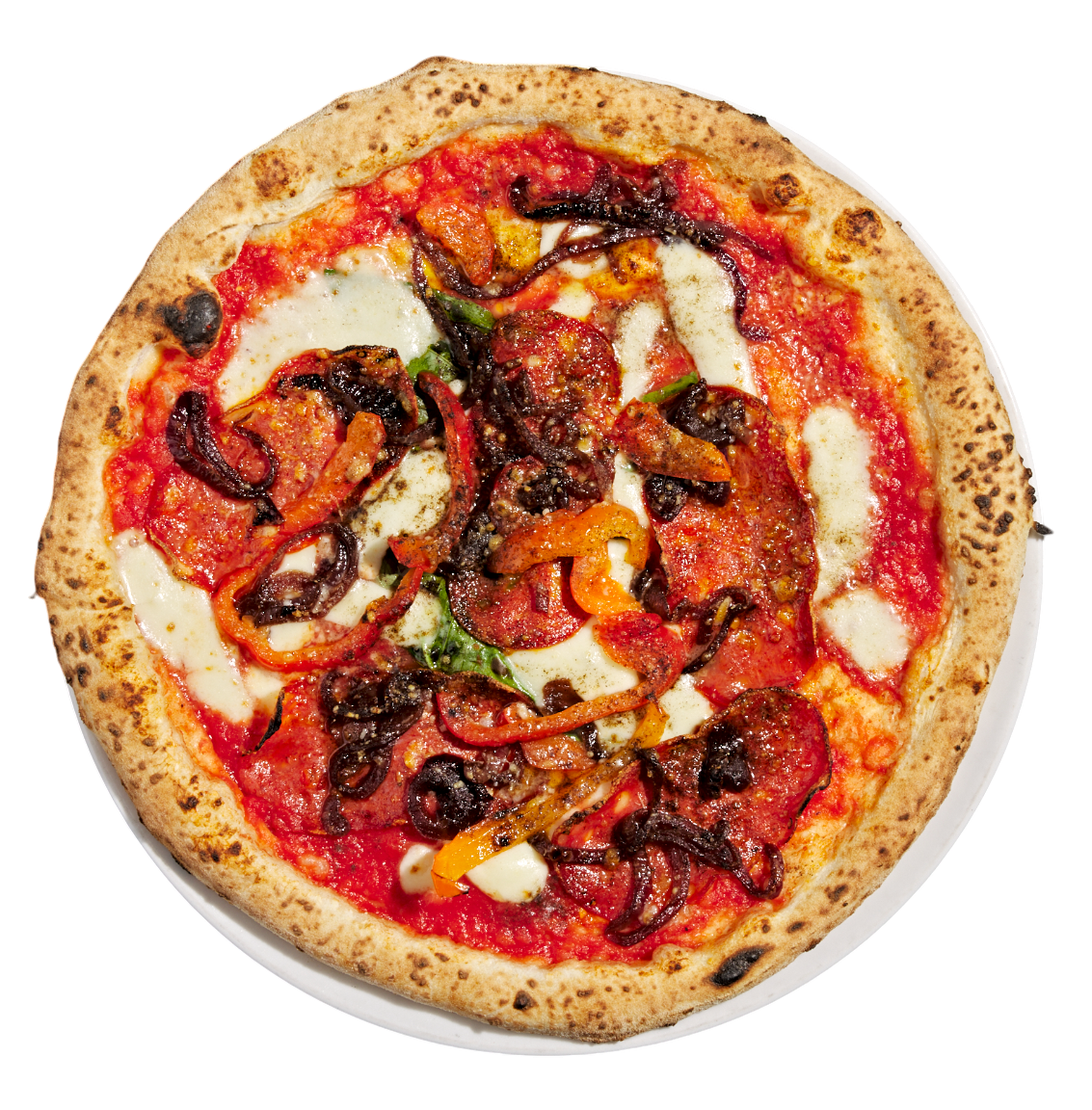 Tomaattikastiketta napolilaisista tomaateista, Pecorino- ja Gran Biraghi -juustoa, basilikaa, savustettua Provola- juustoa, Spianata Calabra -salamia, paahdettua paprikaa, karamellisoitua sipulia, mustapippuria, oliiviöljyä